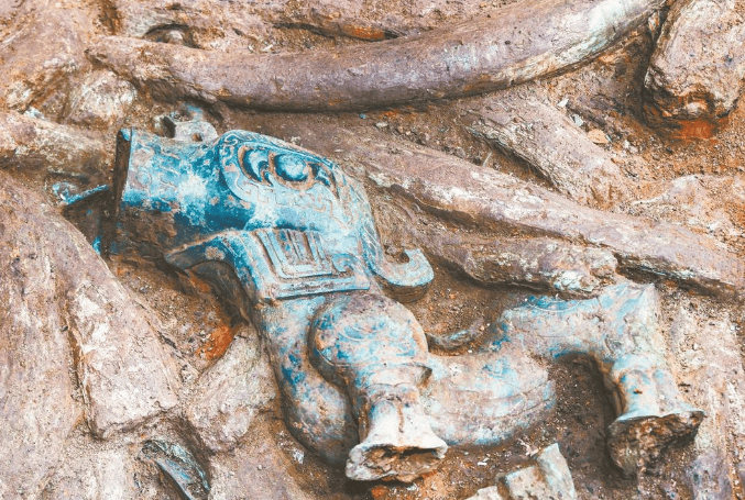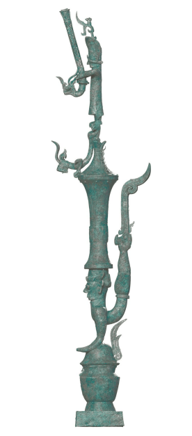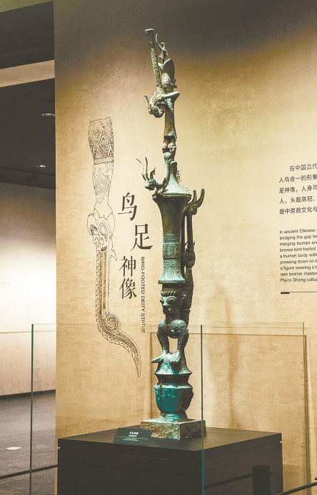 由三星堆多坑部件拼接的“铜罍座倒立鸟足顶尊神像”