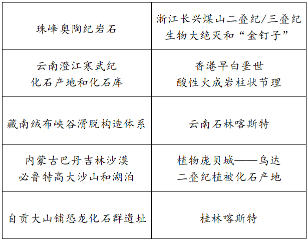《世界地质遗产地名录》由国际地科联评定,主旨是定义和遴选全球具有高度国际科学意义的地质遗产地。2022年10月26日,国际地科联在西班牙公布全球第一批(100个)地质遗产地名录,中国有7个地质遗产地入选。加上这次入选的3个地质遗产地,中国已有10处地质遗产地跻身《世界地质遗产名录》。它们分别是: