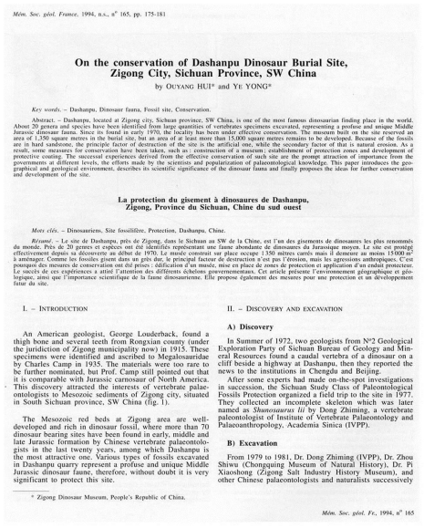 刊登在法国地质学会会刊第165卷上的欧阳辉、叶勇英文论文:“On the conservation of Dashanpu Dinosaur Burial Site.Zigong City,Sichuan Province, SW China”《论中国西南四川省自贡市大山铺恐龙埋藏遗址的保护》