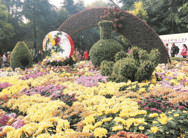 成都从古至今都是一座爱菊之城、菊盛之城。早在汉代,成都就有菊花种植,在蜀郡守文翁所建的石室书院内,就曾发掘出菊花浮雕。宋人景焕撰《牧竖闲谈》记载:“蜀人多种菊,以苗可采,花可入药,因旧悉植郊野。”到了清代,秋季的成都,更是被金红相间的菊花所环绕。据民俗专家刘孝昌介绍,那时成都三洞桥、东郊,还有龙爪堰遍布花农,光三洞桥周边的菊花花农就有20多户。其中最有名的花农当属《成都通览》中提到的朱懋先,此人曾经种植过上万株菊花,品种上千,如深紫、墨紫、金红、朱砂香菊等,这些菊花成为后来人民公园菊展中名贵品种的来源。