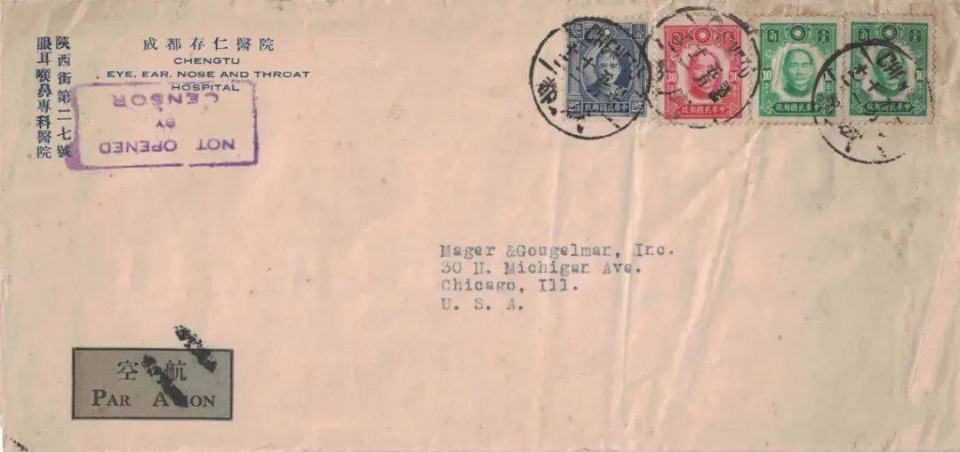 成都存仁医院公函封,1941年5月11日经香港检查国内局部航空寄美国,信封标明存仁医院已经为眼耳喉鼻专科医院。