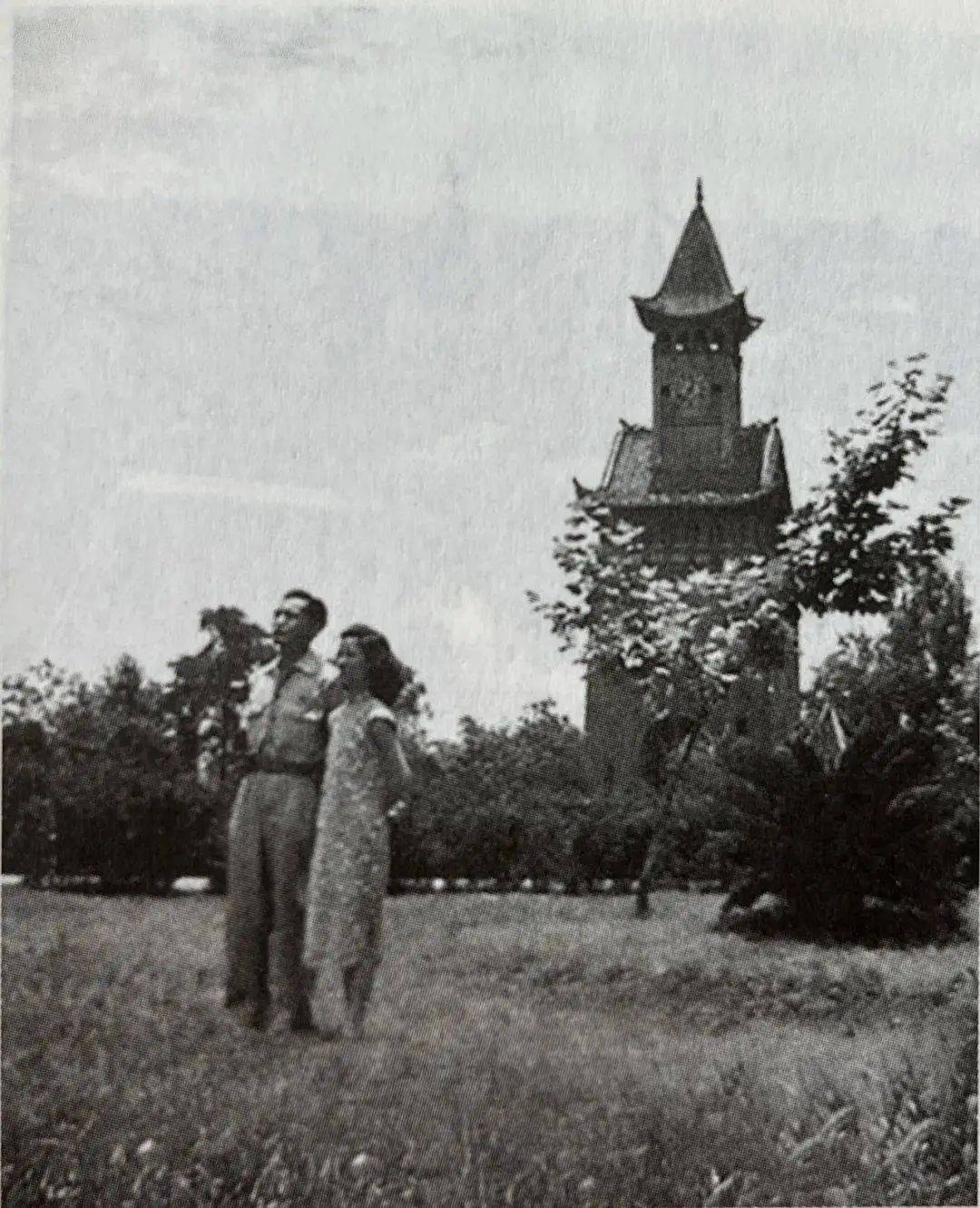 华西协合大学医学院最后一届毕业生陆承恩即将要告别华西,去美国工作前和女朋友在钟楼前合影。