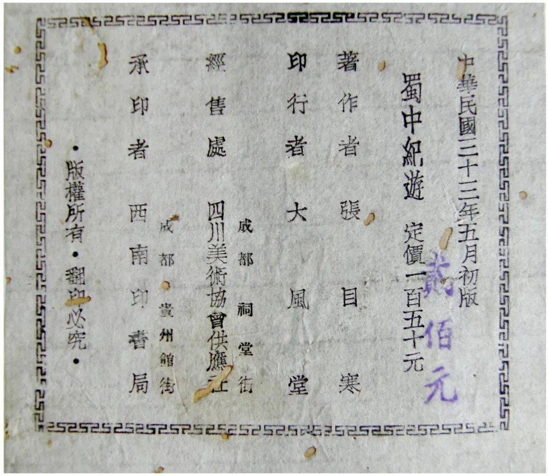 左:1944年11月,《新艺》在成都创刊。张大千题署第2期刊名;右:1944年5月,大风堂印行的《蜀中纪游》(张目寒著),由四川美术协会供应社经售)