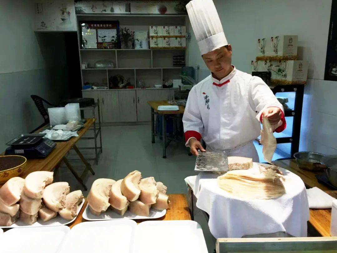 来到李庄,只见店家大都早起至菜市精选半肥半瘦的二刀猪肉,整坨冷水下锅,加香料、盐巴以小火慢炖。肉至全熟揭锅捞出,师傅放案板上操大刀片薄,每一片都又大又薄。刀工可是李庄白肉的精髓,更是李庄师傅的独门绝活。只见师傅大刀一挥,一片薄如蝉翼的白肉片落成。十几刀下来,一盘李庄白肉便可端上饭桌。佐以蒜泥、生抽、花椒、醋、葱花调制的川味蘸碟。效仿有经验的食客,我们拿筷子牵拉起一长片白肉,甩两转、卷成卷,蘸点蘸料,舌头轻轻抿一下缠绕着酱料的薄肉片,再三两口整片咀嚼下肚,那快活的滋味和感受,简直不摆了。在李庄古镇,驻足各家饭馆餐厅门口围观击掌师傅片肉刀工之快、切肉之薄的飒爽英姿和看家绝活,宛如一道独特靓丽的风景线。