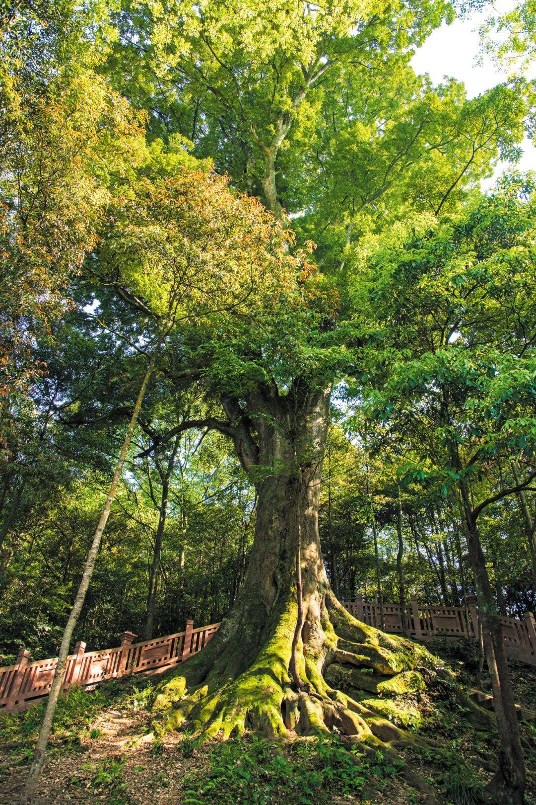 数百年前,其中一株桢楠曾遭雷击,树干被雷电击中却依然保持着旺盛的生命力,枯了的枝干上长出新枝,年复一年,古树不断向另一方向生长,终于重新长出健壮枝干。