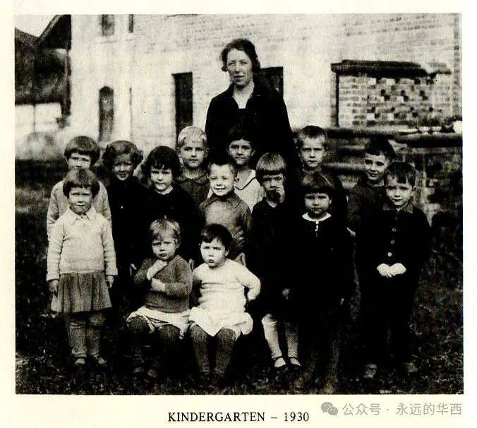 1930年,5岁的维维安在CS学校的幼儿园。前排坐者: Joan Smalley, Margaret Simkin中间一排: Frances Kilborn, Edith Walker, Bruce Dickinson, Margaret Phelps, Margaret Smalley, Bobby Moncrieff。最后一排: Mary Kilborn, Dorothy Simkin, Bob Hibbard, Ms. Plowman, Vivian Anderson,Bill Hibbard, Omar Walmsley。