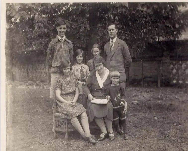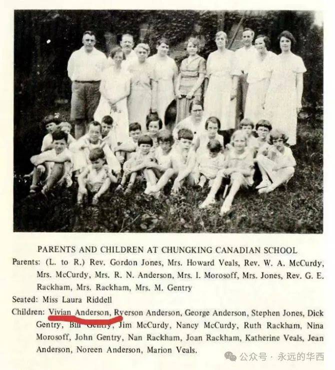 在重庆CS学校的孩子们。学校的孩子和老师一起坐在空地上,家长站在他们身后。维维安(Vivian Anderson)和她的4位兄弟姐妹均在这张照片里(1934年)