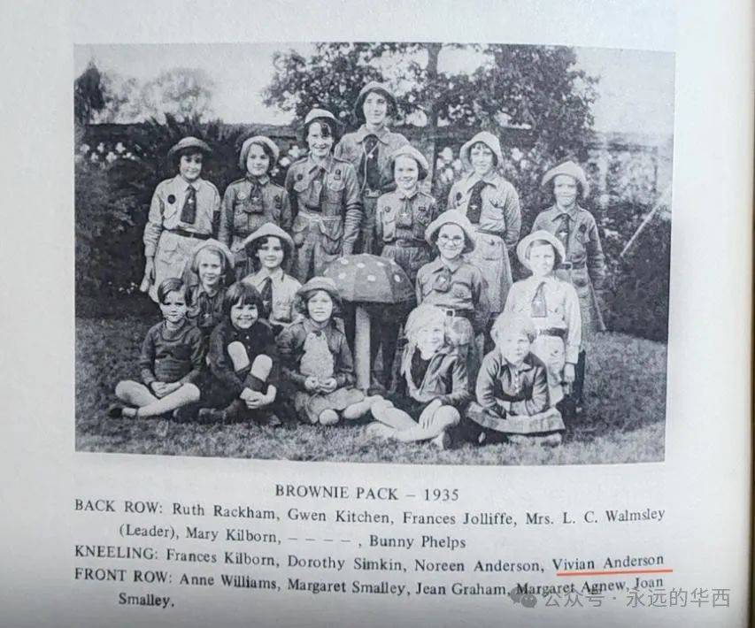 10岁的维维安(Vivian Anderson)成为华西CS学校低年级的女童子军(1935年,成都华西坝)。童子军是当时一个世界性的青少年组织,1907年创建于英国,其宗旨是为成长过程中的青少年提供生理、心理和精神上的准备,培养其独立自主、勇于担当、坚韧自信的优秀品格,使之成为适应未来发展的合格公民。训练内容包括:野外生存训练、绘制丛林图案、学习旗语、信号使用、丛林挖坑、帐篷露营等。