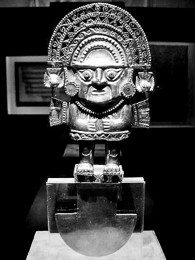 值得一提的是,除了印加文化,在秘鲁的古文明中,黄金面具在西坎文化中出现最频繁。该文化的黄金面具以精致的工艺著称,通常具有神秘的面部特征,如大眼睛、抽象的面部表情和装饰性的耳环或头饰,主要出现在高等级的墓葬和宗教遗址中。它们不仅代表地位和权力,也被认为具有护佑灵魂的力量。