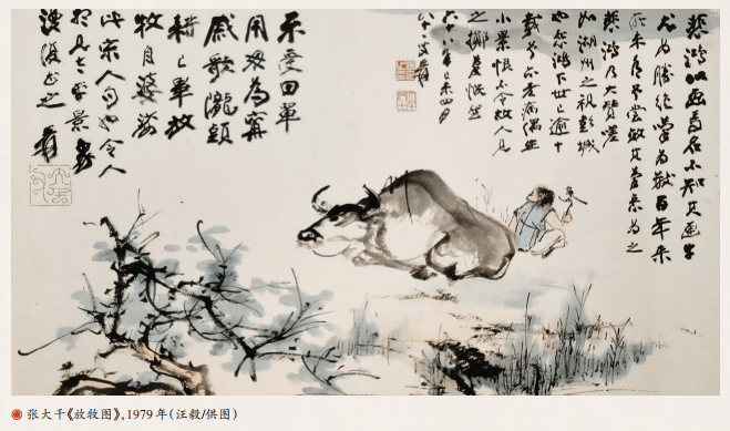在张大千的绘事记录中,他一生极少画牛,这或许与之怜悯牛之辛劳和辛苦有关。从他幸存的一组白描稿牛图(包括《放牧图》《群牛图》《奔跑牛》)和所临《敦煌北魏壁画牛》《五牛图》及20世纪30年代初创临的《牧童牛背图》来看,特别是从他暮年(1979年)创作的《放牧图》来看,似乎与他1949年启用“税牛广”钤印的心境如出一辙,即期待他这条牛在辛勤劳作后,可以安享田园的自由自在之乐。其意表达和心境写照,诚如他在《放牧图》中题款宋人诗句:“不受田丹用,毋为甯戚歌。陇头耕已毕,放牧自婆娑”,亦诚如其师李瑞清在上海鬻字为生时的期许:“如牛力作,亦足致富。”不仅如此,张大千还自喻和自嘲当牛的劳碌命,甚至还换一种表达方式,即在若干画作中钤印“大千长年”“八德园长年”“长年湖海”“张大千长年大吉又日利”,调侃他系“长年”(长工),以“人间乞食”。当今诗人李航的“敦煌橐笔近三秋,到此老夫自比牛”诗句,或许是张大千自谓“牛”的走近解读。