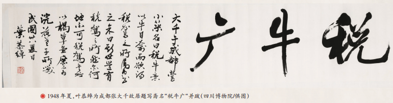 如果说内江是张大千的出生地,那么可以说成都是张大千在中国大陆特别重要的“家”,即旧居。其由:一是成都是张大千(大风堂)的“大本营”。从1938年至1949年,张大千在这里生活逾11年(包括期间暂离成都),且正值盛年;二是成都系他唯一置有房地产业的地方,具有“家”的特定意义;三是这里有他的兄嫂、夫人、子女、弟子、故交等;四是这里有他攀登艺术高峰的记录;五是这里系他人生走向世界的起点,使他成为“世界的张大千”。基于此,这便注定了张大千与成都的不解缘情,也注定了无论他走到哪里心灵深处总是保持了与成都“两点一线”的关系。基于此,张大千在成都,特别是关于他的家“税牛广”便有了特别的讨论意义。其讨论范畴,包括张大千画落款“税牛广”、画钤印“税牛广”和叶恭绰应邀书题的张大千斋名“税牛广”。通过讨论和诸关系互证(张大千画落款、画钤印、叶恭绰书题),以正视听,为张大千故居更名“旧居”提供历史依据(或从地名角度,更名“金牛坝张大千旧居”;或从人文角度,更名“张大千税牛广旧居”;或从整合地名和人文角度,更名“金牛坝张大千税牛广旧居”),为张大千旧居修缮和展陈等提供学术支撑。