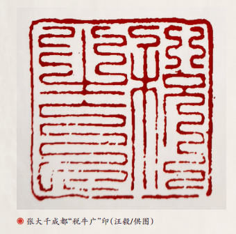 张大千不仅画作落款“税牛广”(这个时间段仅为1949年),而且还在画作中钤印“税牛广”。这方印属于斋印范畴,为“叠篆印”,2.6厘米见方。其特点,据杨诗云《张大千用印详考》介绍,线条粗细富有变化,工整中求移让,印文曲直方圆并举,有古玺印感,传递了端庄、大气和古意的信息。印篆刻者不详,极有可能为张大千自刻。