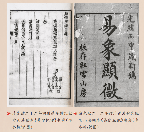 其中,《易学探源》凡上下2卷,清光绪《新修潼川府志》及清光绪《蓬溪县续志》均有著录,今有清光绪二十二年(1896)钟氏红雪山房刻本传世。此本扉页题“易学探源易象显微合刻”,署“蜀北薇垣钟瑞廷著”。卷首有清同治十年(1871)钟瑞廷《叙》,以及是书之《义例》《目录》。正文辑著内容,上卷依次为《河图说五则》《洛书说四则》《旧作洛书金火易位论》《图书总论二则》《旧作观易玩河图洛书七古一则》《伏羲先天八卦图说五则》《文王后天八卦图说四则》《先后天总论三则》,下卷依次为《伏羲大圆图说》《八卦相荡图说》《八卦相错图说》《十二辟卦图说四则》《伏羲大方图说》《文王六十四卦次序综图说》《文王六十四卦反对变不变图说三则》《孔子太极图说二则》《旧作太极图赞》《古太极图来子太极图合论》《先后天性命图说四则》。另《目录》及卷下首页皆有“蓬溪钟瑞廷薇垣氏辑著”“男永绍定显祚子介安良承参校”字样,可见此本乃是钟廷瑞自著,后经四子钟永绍(子介)、钟永定(子安)、钟永显(子良)、钟永祚(子承)参校,而刊刻于红雪山房。