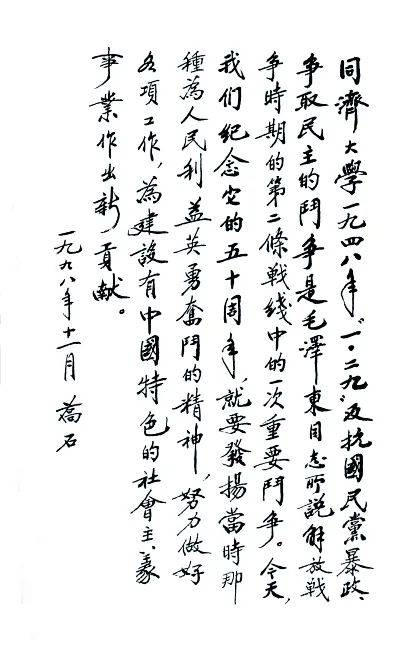 1998年,乔石为《冲破黑暗迎曙光——纪念同济“一•二九”事件五十周年》题词。