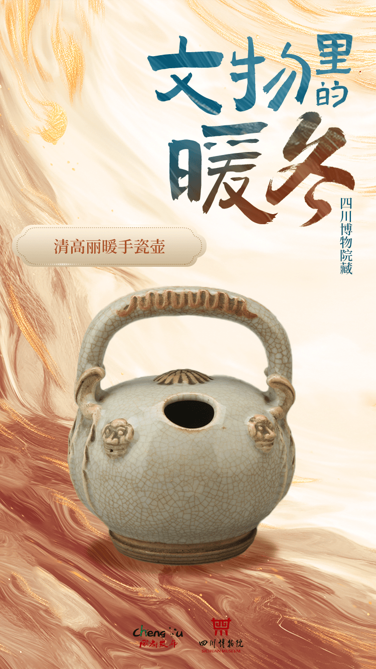 在风靡一时的古装剧《甄嬛传》中,到了白雪皑皑的冬天,各宫小主们手中都抱着一个精致的小炉子,好用又好拿,令人羡慕。其实,古人很早就发明了瓷壶,把热水灌入陶壶瓷壶中,就成了一个暖水袋,适用各种场景。四川博物院藏的这款清高丽暖手瓷壶,外型乖萌,做工十分精细,为了便于携带还配备了提梁,抱在手里温暖又不烫手。