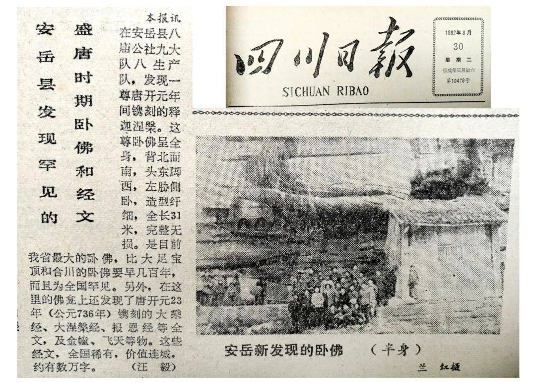 《安岳县发现罕见的盛唐时期卧佛和经文》汪毅文,载《四川日报》1982年3月30日。为省级媒体第一篇关于安岳卧佛与佛经的报道。
