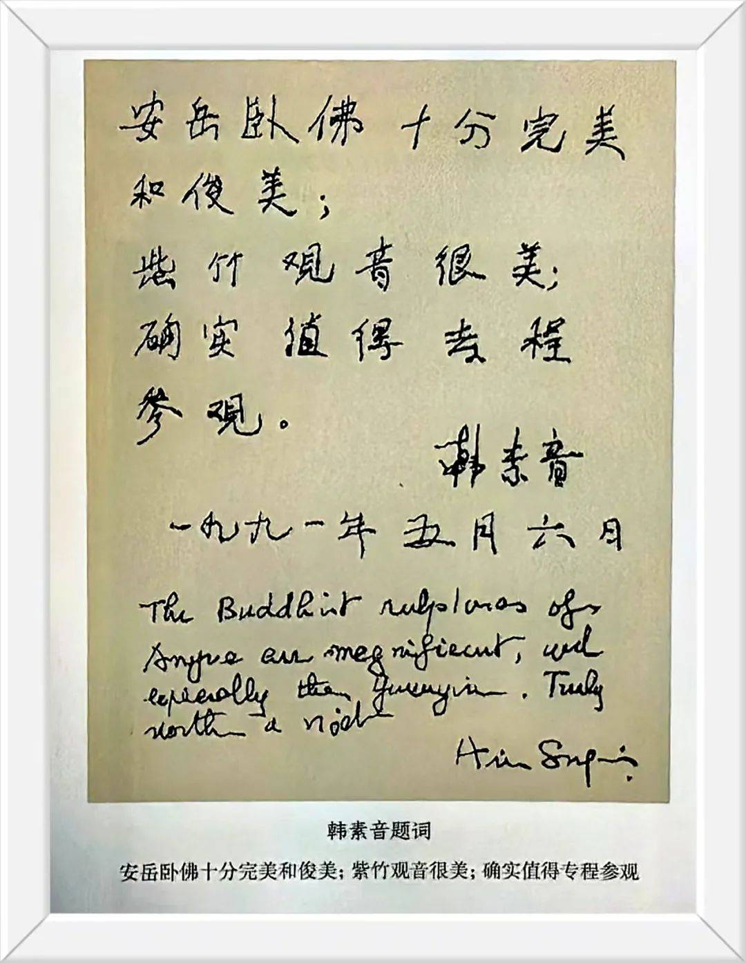著名英籍华人作家韩素音题安岳石刻:安岳卧佛十分完美和俊美;紫竹观音很美;确实值得去专程参观。