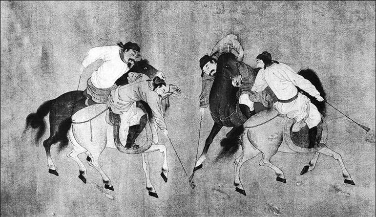 马球运动在唐代尤为兴盛。据《封氏闻见记》记载,唐中宗景龙三年(709年),金城公主远嫁吐蕃,吐蕃王派遣大臣前来迎接。吐蕃王知道唐中宗是资深的马球爱好者,便同时派遣了一支马球队,要与汉人进行一场“友谊赛”。吐蕃是游牧民族,兵强马壮,技艺精湛,唐朝球队两场皆输。唐中宗李显十分懊恼,便命临淄王李隆基与其他几个贵族子弟一起,组成一个“超级战队”,上场与吐蕃队一决高下。开赛之后,李隆基策马奔腾,“东西驱突,风回电激,所向无前”。吐蕃队望尘莫及,只得认输告败。中宗挽回了颜面,欣喜异常,赐绢数百缎。