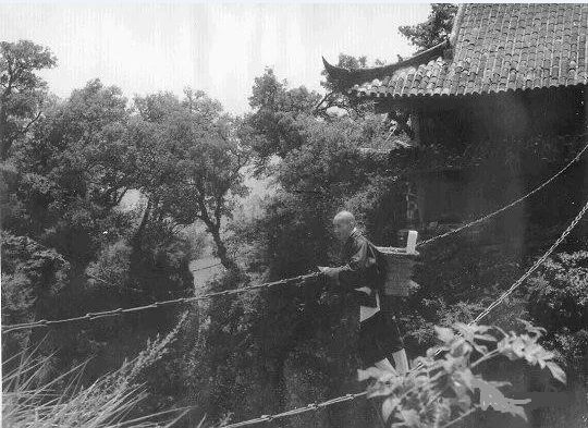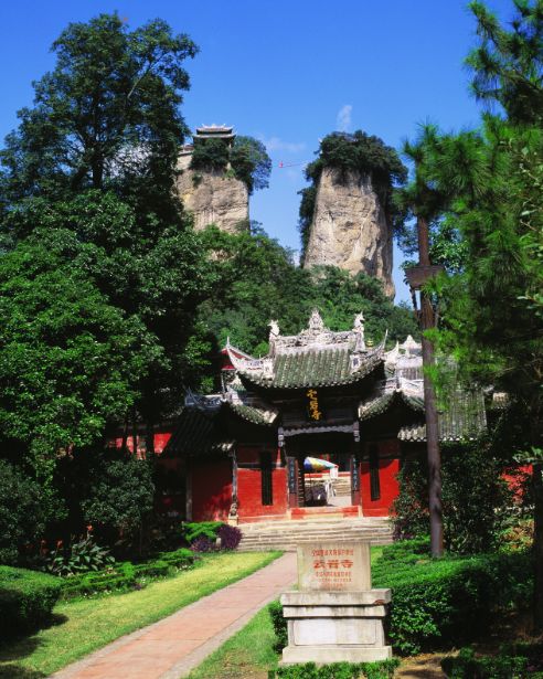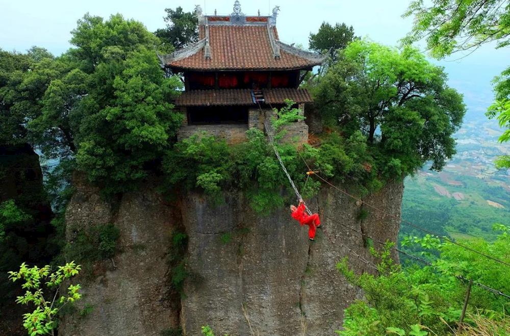 其实,窦圌山为典型的丹霞地貌,由于地质运动,风蚀雨溶,形成了三座笔直矗立的奇特石峰。西为问月峰,上有东岳殿;北为神斧峰,上建鲁班殿;南为飞仙峰,建有窦真殿。三峰中仅问月峰有石径可上,东西二峰仅一根铁索相连,铁索下面是万丈深渊,一般人站在悬崖边上朝下看都会感到头晕目眩,只有身怀绝技、胆识过人的人才能从容渡过。