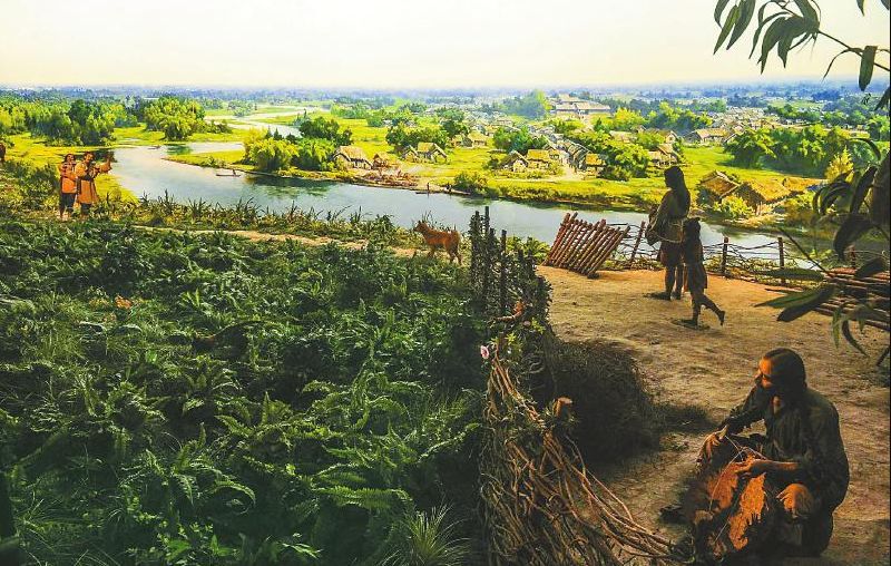 3000年前的成都平原呈现出一派森林密布、河渠纵横、动物繁多的景象。摄于金沙遗址博物馆大型半景画(吴传明摄)