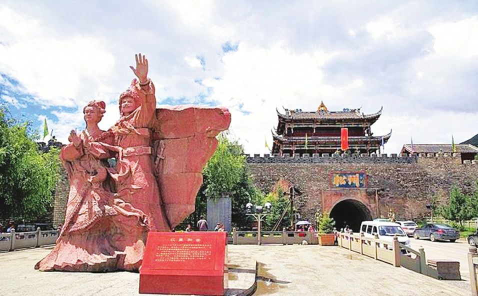 文成公主与松赞干布的雕像,位于松州北门(镇羌门)之外。塑像形态是:松赞干布右手揽着文成公主,面带笑容,左手指向西边的茫茫雪山。