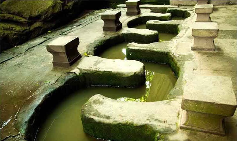 宜宾市岷江东岸的崔科山下,有一处巨石裂成的天然峡谷,长约60米,两旁崖高20多米。几块大石高耸成山,有一股泉水在峡底蜿蜒流出,又没于石缝中,黄庭坚对这个天然的山水景致尤为赞赏,他依山凿池,造了一方长5.2米,宽0.2米,深0.55米的池子,池为九曲形,泉水从岩中流出,水流九折。池边设了八个石凳,宾客可围坐于九曲池边,把酒杯置于流动的九曲池中,围座者吟诗唱和,一曲之后,池中酒杯停靠在哪里,对应凳上的人就该饮酒作诗。