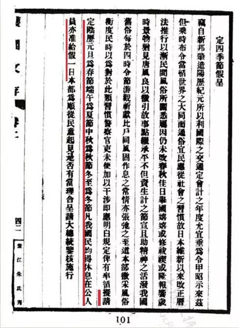 1914年1月21日,朱启钤在致大总统袁世凯的《定四季节假呈》中写道:拟请定,阴历元旦为春节,端午为夏节,中秋为秋节,冬至为冬节,凡我国民均得休息,在公人员亦准给假一日。……呈请大总统鉴核施行。