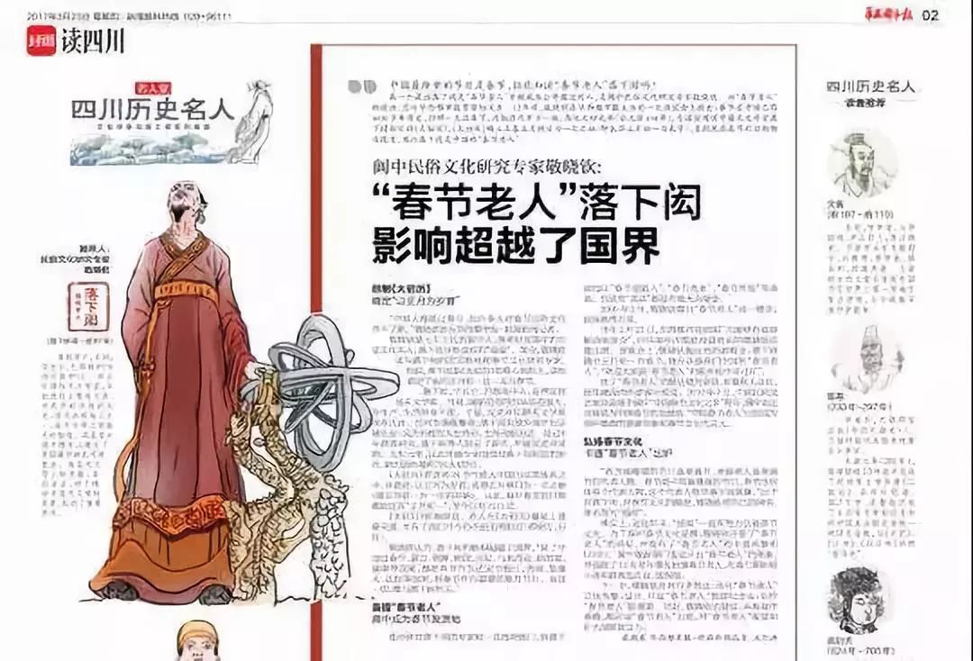 7. 第一次公开报道“落下闳是春节老人”的媒体是华西都市报。刊于华西都市报2005年2月24日第八版,标题是《南充请出“春节老人”》。