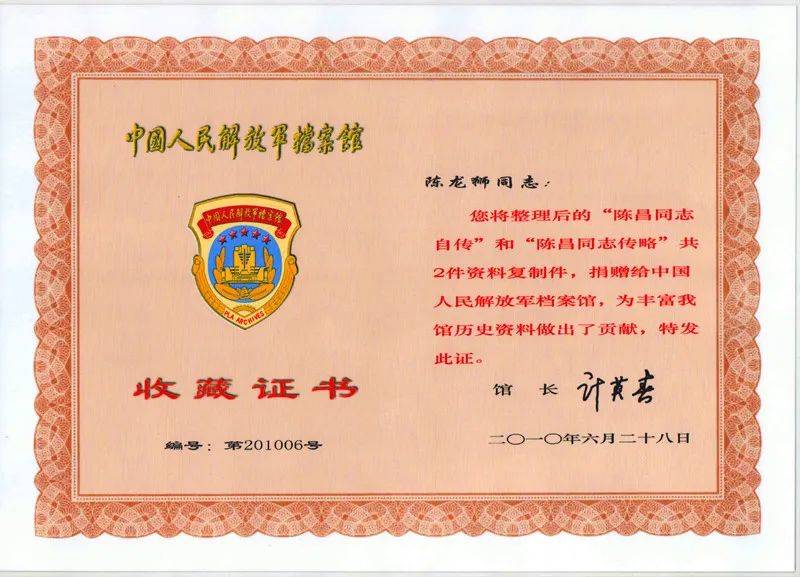 中国人民解放军档案馆颁发给陈龙狮的收藏证书