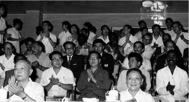 当邓小平副主席等领导人走上主席台时,全场观众长时间地热烈鼓掌。