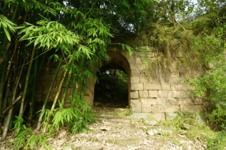 《富顺县志》载,北崖两百尺高处还有遗迹奇观,半壁镌“龙蟠虎踞”四大字,字径丈许,字迹数十里外清晰可见,据说是明四川布政使李维所题。我们却寻找未见,考古工作者也没有勘查记录,想来大概是被杂草青苔封蔽了吧!千佛崖上下,过去所建有诸多亭宇,已毁,遗址宛然,众人感叹不已。转过一道山梁,突然发现半道危崖上有一小块平地,当地人用粗大的条石砌起一座宏大的寨门,沿险要处也筑有城墙。老陈说:“这是北门,叫中华门,建于大明弘治十七年六月”。历经百年栉风沐雨却保存完好,实属不易。历史上四川多有兵患匪扰,因葛仙山四壁易守难攻,当地民众士绅选址山上建立寨堡,四周筑有城墙,蜿蜒于悬崖绝壁边沿,绕文峰骏一周,长约5000米。山上最初设3道门,即王果在嘉庆九年(1804)提到的,分别为东方太平门、北方中华门、西方崇果门。咸丰后,民变增多,士绅杨、郭二家又修筑四道门,两个在二层岩,两个在山顶。二层岩两门叫啥,现已无考,一个位于西边,另一个在东边牌坊处,遗憾的是,现场残垣断壁皆无,消失在历史的烟雨中了,没人提起很难知晓。庆幸的是,山顶那两个,多了道历史的沧桑,一个在东南方,城墙已毁,名字不详,城门犹存;另一个在南,叫保和门,高压电线塔下边,城门还在,城墙大部分已拆除。城垣全由他处的石料磊成,许多还是由大条石垒成,工程之大、之艰,让人震撼,足见当地历史上的富庶。