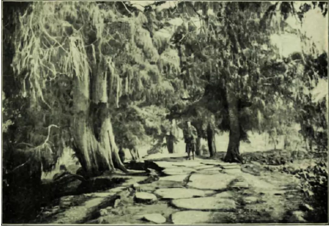 在路上的雪松(香栢)林里,有两座非常精致的古庙,由棕色的雪松木建成,供奉着文神和武神,周围有最富特色的小山环绕着,这是一个可爱的场所,香客的潮流势不可挡地朝它们涌去。这里的武神与其他地方一样,非常吸引妇女,在上海的本土旧城里仿佛见过他的一座大庙。永久的香柱点燃在这些祭坛里,僧侣们声称这些庙大概是两千年的古物了。