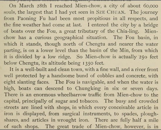 这是一座建设得很好又干净的城镇,城墙完好,护城河由漂亮的卵石混凝土堤岸保护得很好,有8个斜面。涪江可以行船,涨水时,船走下水六七天可达重庆。从绵州到省会的交通线上有大量的独轮手推车,主要运送糖和烟草。忙碌拥挤的街道商铺成行,其中陈列着可以想象到的铁器,从外科手术器具到铁锹、铧头、熟铁锻打的器具。这种店铺整整有半英里。然而,绵州的大生意是丝绸,邻近地区纺织棉花。商店里陈列着德国和日本的小摆设、外国纱、印花布,此外,还有甘肃的毛皮、锦缎、丝绸、寺院家具和药材。这些店铺有各样值钱的东西,显示了附近地区有很强的购买力。