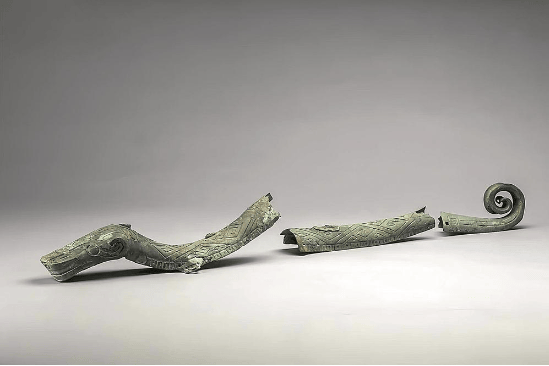 其中的一件商代青铜蛇,残为三段,头部残长54.5厘米,宽14厘米。民俗专家刘孝昌介绍,此蛇采用分段铸造法制成,连接处有铆孔,然后浇注铜液将各段铆嵌。该蛇头部宽大平直,蛇头昂起,蛇尾上翘向前内卷,似乎正准备对猎物发起攻击。