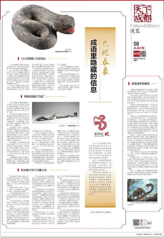 “巴蛇吞象”,固然是一个具有比喻意义的成语,但也透露出极为丰富的历史、地理与气候信息——在数千年前的巴蜀大地上,雨水充沛,气候湿热,丛林里蛇与亚洲象并存。这两种动物,也是某些氏族部落的图腾。而部落争战的信息,也藏在“巴蛇吞象”这个成语之中。