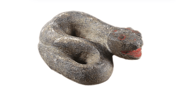 蛇头微微上昂,蛇嘴大张,露出血红的蛇口来。这片红色,乃是涂抹的朱砂矿物颜料。蛇的眼珠呈黑色,而眼珠与蛇头之间也涂抹了一圈红色,真实地呈现了虹膜与瞳孔的关系。石蛇埋在地下,经历了3000年左右的时光,色彩依然鲜明。