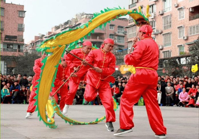 “耍龙灯”一般在正月初一“开灯”,正月十六“倒灯”(结束)。龙灯分为布衣龙灯、大龙灯、草龙灯、板凳龙灯等不同的“龙”表演。布衣龙灯,一般由十二、三人组成阵式,有舞龙经的“武阵”、唱念猜字的“文阵”。其套路变化多,“龙”体灵活。大龙灯,一般龙身在15节左右,每节内可点火烛。龙头重达30余斤,舞动时每节由一人执柄,常做“之”字形或“S”形舞动。灯火连成一片,甚为壮观。草龙灯,主要是用自贡地方特产“芦草”编制而成,由5~7人舞动,灵活逼真。板凳龙灯,是在板凳一头扎“龙头”,另一头扎“龙尾”,多是兄弟俩共舞,才能配合默契,显“龙”之机敏。当年,自流井的“祥龙会”、大安的“黄龙祥会”,表演技艺精湛,很是出名。