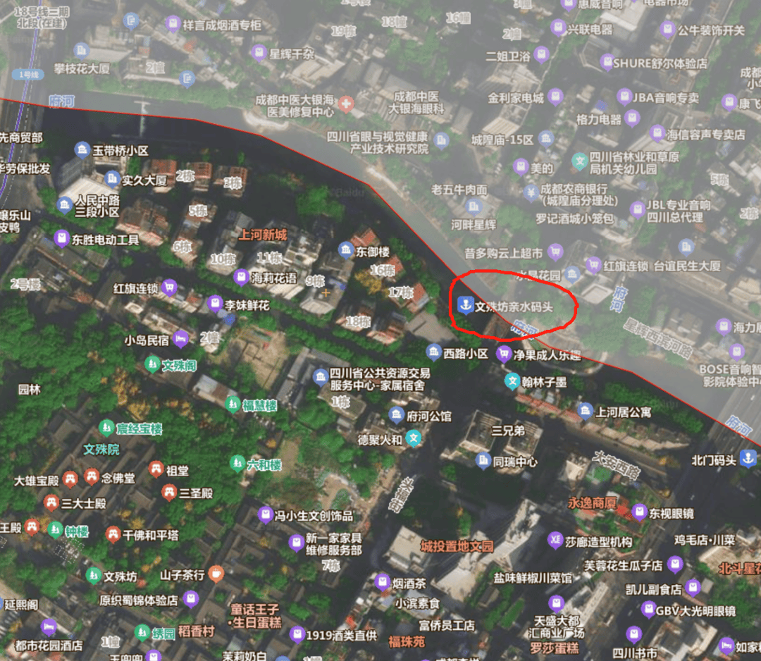 过了北门码头,向西走一段路,南边就是赫赫有名的文殊院,而北边则是文殊坊亲水码头。关于文殊坊亲水码头的名字由来,没有任何的记载,仅凭猜测而言,文殊坊不难理解,“亲水”一词,可能源自人们希望府河水情平稳,也可能是住在府河附近的人们依靠府河谋生,虽然真相已经无从考证,但我们都能从中感受到老成都人追求的人与自然和谐发展的愿望。然而,让人遗憾的是,不仅文殊坊亲水码头的名字无从考证,就连关于它的故事也没有任何记载。或许,如今关于亲水码头的故事,只能从极少数老一辈人的口中才能听闻一二了。