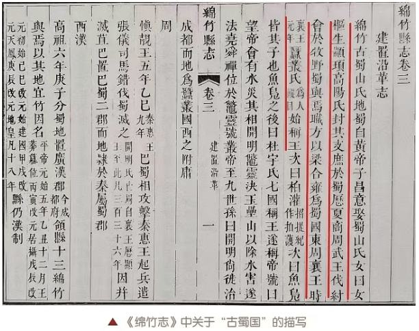 对于蚕丛氏开创古蜀国的过程,四川很多地方志也都有详细记载,尤其是《绵竹志》:“绵竹,古蜀山氏地。蜀自黄帝子昌意娶蜀山氏女,曰女枢(昌蒲),生颛顼高阳氏,封其支庶于蜀,历夏商,周武王伐纣会于牧野,蜀与焉。职方氏(周行政区划)以梁雍为蜀国。东周襄王(约公元前651至公元前619年在位)时,蚕丛氏史称王。”这段话大意是:三星堆区域的绵竹,原为蜀山氏,一直到夏商都属于黄帝家族。牧野之战后,周将这里的梁州、雍州合为蜀国,直到东周第六代君王周襄王即位元年,纵目的蚕丛氏称王。