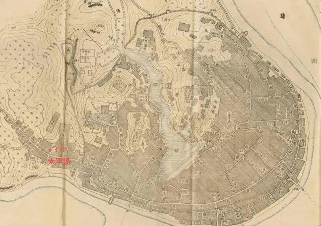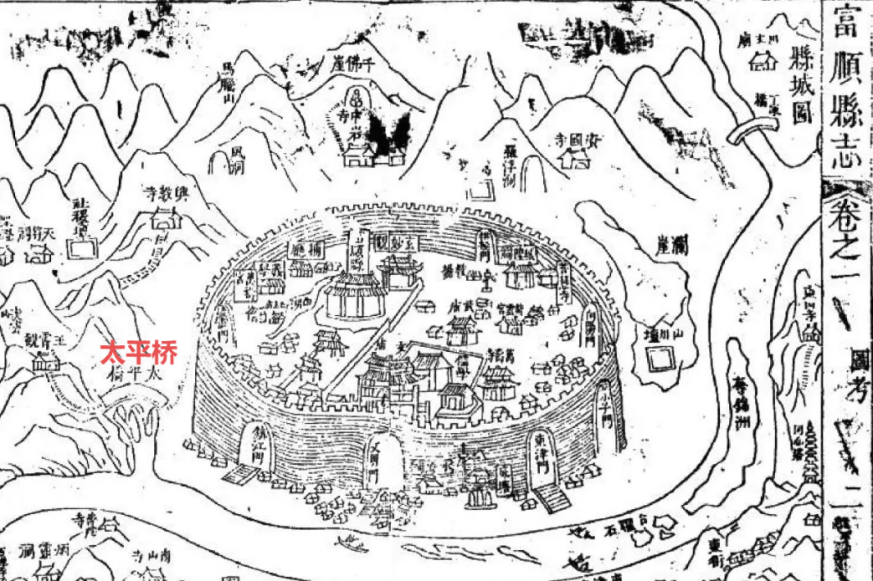 关于养济院(广仁堂)的位置,多部旧志记载均在县治西关外太平桥。清代在西关外设太平保,为城厢六保之一。民国时期设太平团,后并入釜江镇。在民国《富顺县街道图》可见太平场(街),太平团除玉霄观、三元宫外,还有教养工厂、米市和广仁堂。据考证,三元宫供奉天、地、水府大帝,在西关外。民国31年(1942)于此设县立女子初级中学校(今富顺老一中),养济院的位置应该就在今老一中内原食堂一带。
