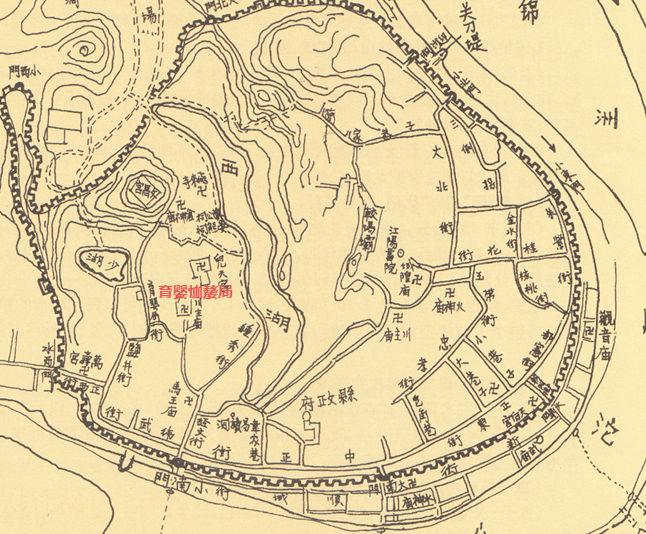 至于育婴恤嫠局的确切位置,据清光绪二十一年《富顺县乡土志》与民国《富顺县志》记载,其位于“治西土主庙下”,而“土主庙治西北,西湖右”,民国《富顺县街道图》中标明了育婴局街,育婴恤嫠局应该在今马门口远大购物中心一带。