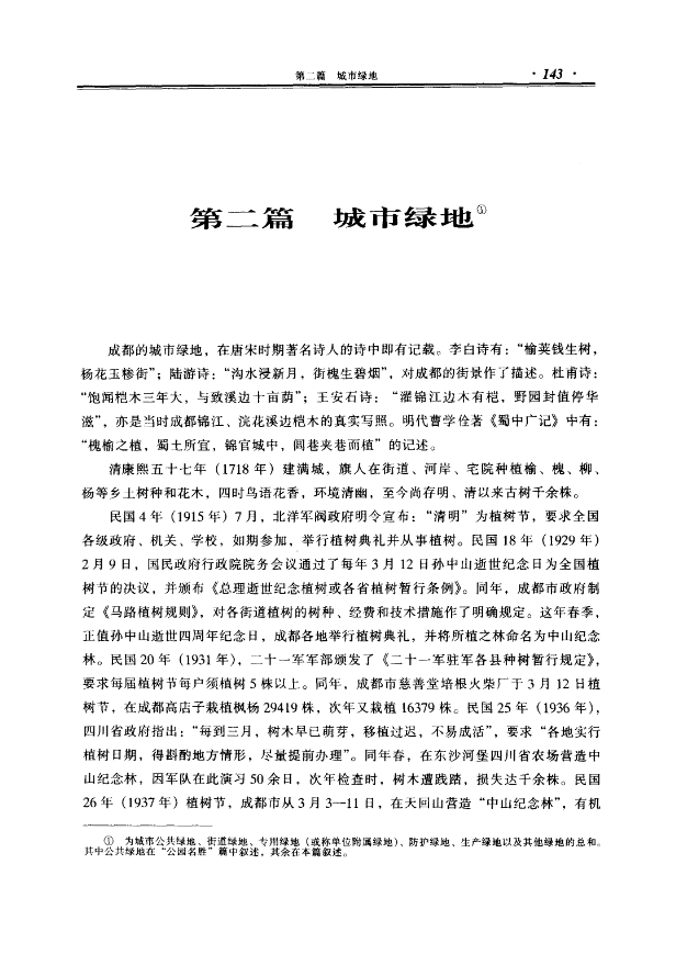 “(1929年)2月9日,国民政府行政院院务会议通过每年3月12日孙中山逝世纪念日为全国植树节的决议……这年春季,正值孙中山逝世四周年纪念日,成都各地举行植树典礼,并将所植之林命名为中山纪念林。”⑯