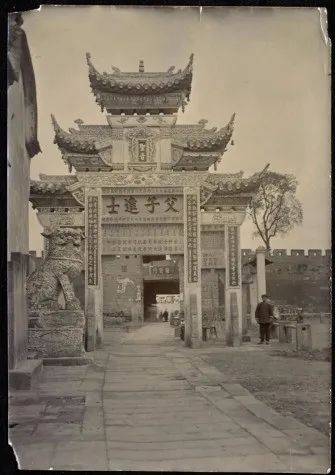 清末民初的某年初春或冬日阴天,天色将晚,青石板路上行人渐少,一老一幼相携走过城门洞,冷风吹着城墙背后一棵树,孤独而萧瑟。一头浑身贴满了碎瓷片的石狮,雄踞在须弥座上,它的背后是一面元宝顶状的风火墙。牌坊下有几户摊贩,等着驿道上来往的行人照顾生意,一位当地男子包青色头帕,着深色短袄,诧异地打量着眼前一位西装革履的外国传教士,坐在石栏后的人们也投来相同的目光。传教士满理从重庆方向而来,取道东大路过璧山永川荣昌隆昌,在内江椑木镇乘船上岸,经黄荆坝、乐贤铺入内江城,在南门外被一座高大牌坊所震撼。东大路上的牌坊不计其数,官民借交通之便在古道上修建牌坊,以达到歌颂政声、表彰功德、宣扬教化的目的。对满理而言,一路上所见牌坊甚多,已是稀松平常,但面对这座精巧的牌坊不由心动,于是在南门关帝庙大门一侧选好角度,架设机器,测光之后,摁下了快门,留下了一帧百年旧影。