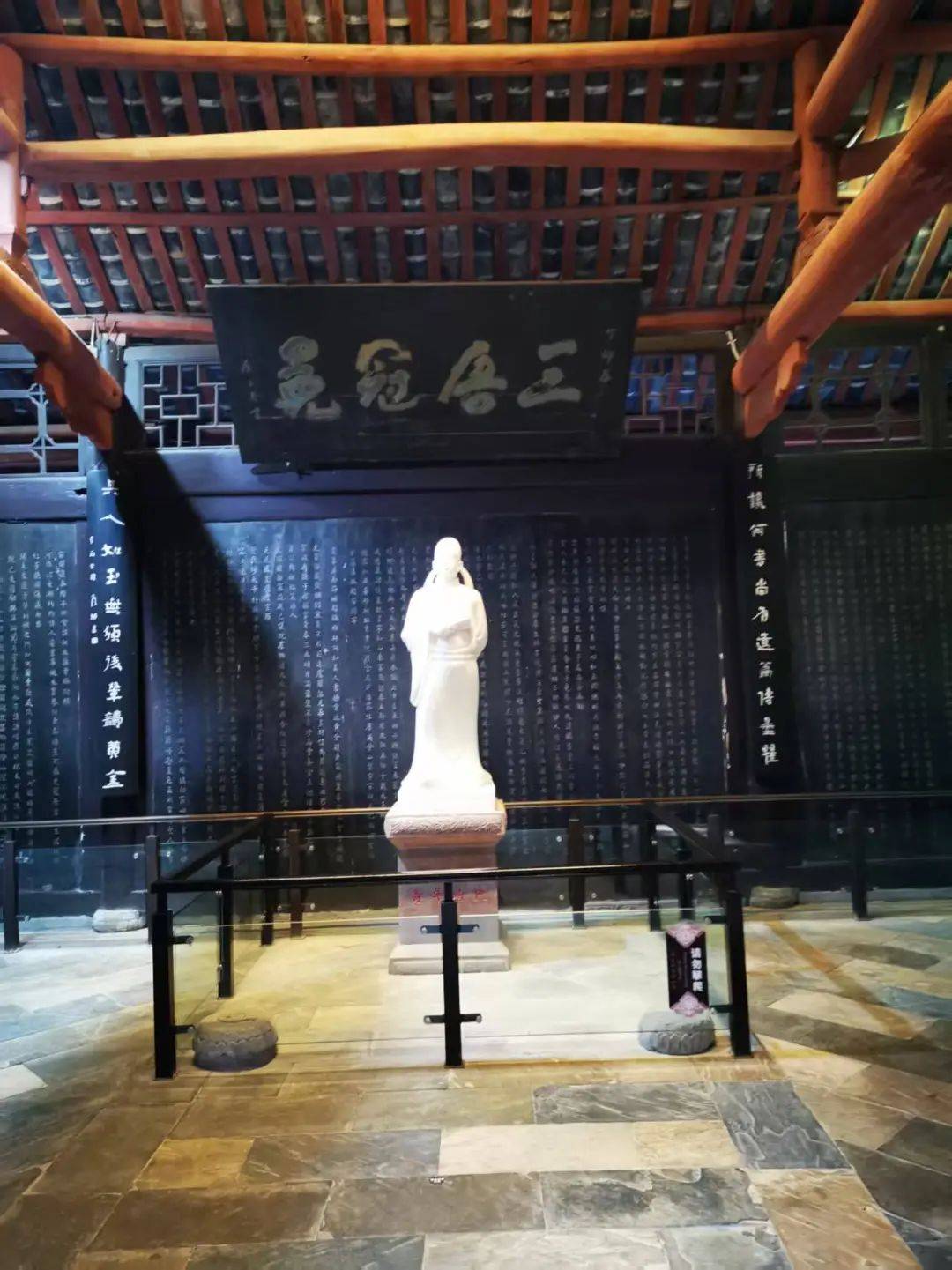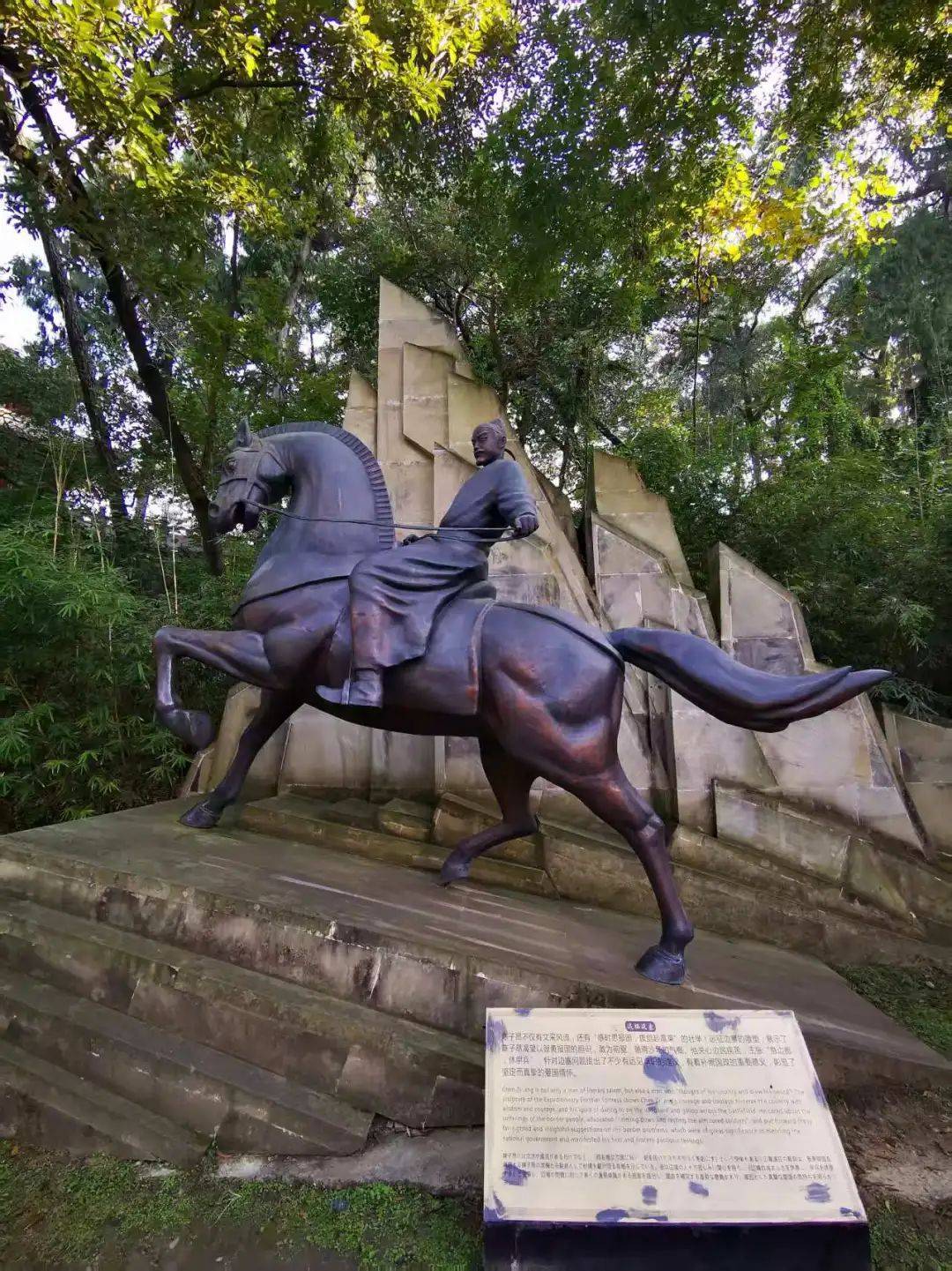 陈子昂读书台所在的金华山不高,但树木蓊蓊郁郁,才到山下,就能感到一阵清凉,直沁心脾。虽是冬日,但阳光明媚,令人神清气爽。读书台的石阶已被时光磨起了“包浆”,可见人们对于这位伟大的初唐诗人的敬重。拾级而上,可以看见沿途关于陈子昂的铜雕,英姿勃发的少年子昂,神骏非凡的铜马,让人仿佛看到他从历史深处走来。山顶是清代重建的建筑,中院的正堂,悬挂着“三唐冠冕”的匾额,下面是汉白玉陈子昂青年时代的雕像,后院的建筑清幽,站在读书台,眺望远方,可以看见陈子昂的故居也是他的衣冠冢所在地。射洪在此地打造了气势恢宏的文宗苑,以“伯玉轩”“唐音馆”“谏诤厅”“文宗堂”展示陈子昂的生平及其功业和在文学上的巨大成就。