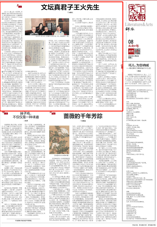 认识王火老师,大概是1999年,人民文学出版社的何启治老师来成都组稿,他在《当代》杂志当主编,刊发过我的一组散文《重现的西藏》,给开始写作不久的我很大的鼓励,我自然要去拜访的。也因此遇见也去拜访的王火老师,还有别的作家,从何启治老师郑重的介绍里,我认识了茅盾文学奖的获奖者,王火老师。那天关于文学的聊天激情四溢,灵感与火花不断在语言里闪现。该吃午饭了,我和柳建伟在玉林的一个川菜馆,请二位老师吃饭。饭间,大家的谈兴不减丝毫。饭后,我们一起送何启治老师回宾馆,继续交谈文学的事情。路上,何启治老师还在与柳建伟激动地交谈,我则陪着王火老师。