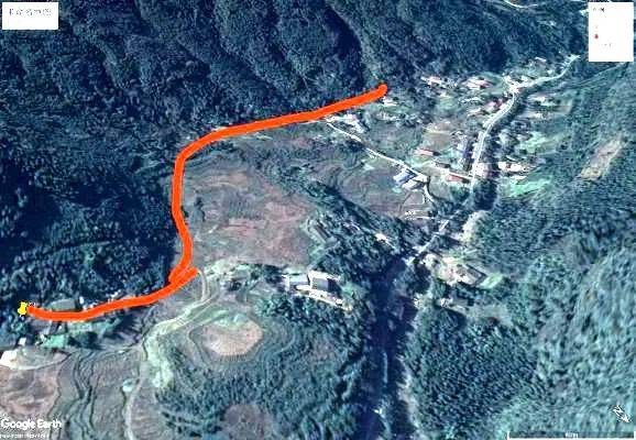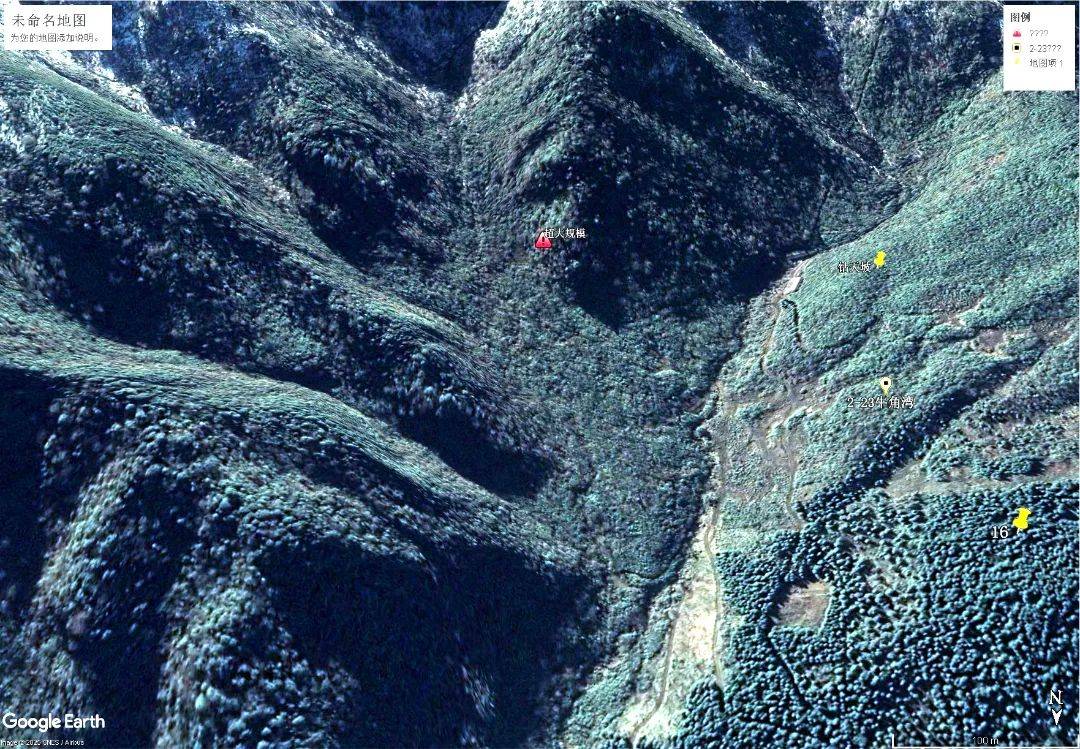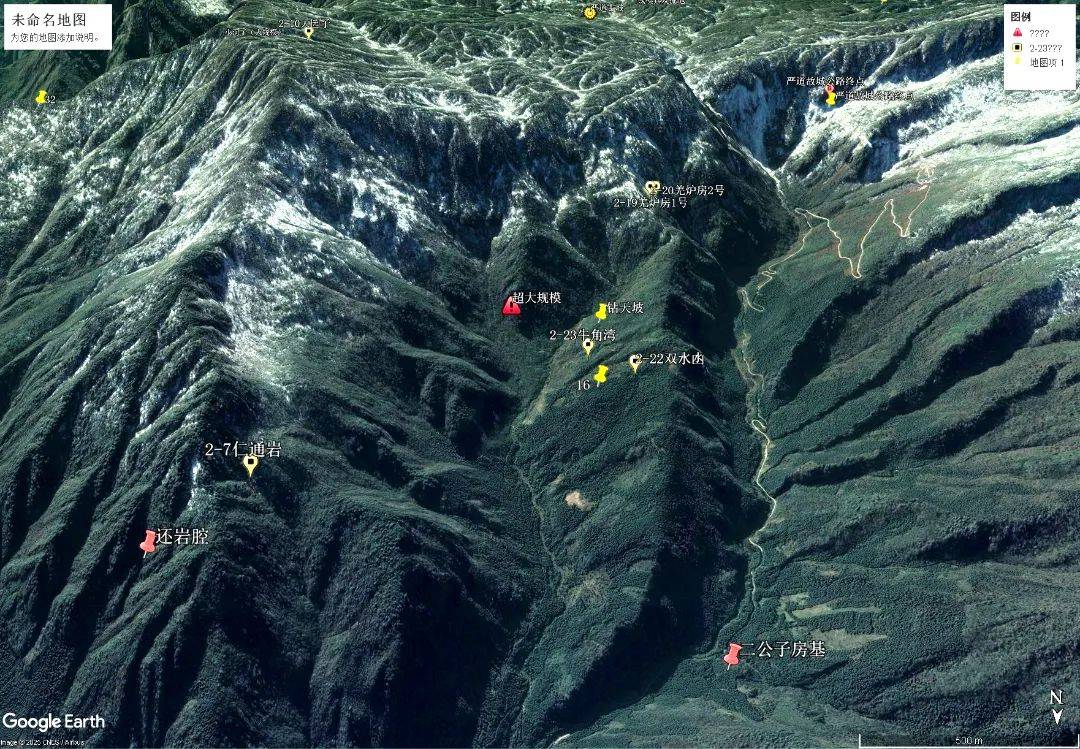 得知这一信息后,考察队立即改变行程前往该记录地点,但由于该地点大部分区域仍被冰雪覆盖,无法观其全貌,仅在堆渣场采集了标本,钻进附近铜洞考察,采集到矿样,最终未能证实该条调查记录,成为此次考察的最大遗憾。回到成都后,笔者通过卫星地图查看该区域,清晰直观地看到该地山沟中存在巨大的堆积体,这在很大程度上增强了该记录的可信度。