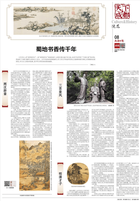 蜀地先贤的读书故事,是“穷且益坚,不坠青云之志”的生动写照。无论是苏氏父子的家风传承,还是扬雄、杨慎的逆境治学,皆是“立身以立学为先,立学以读书为本”(出自欧阳修《欧阳文忠公文集》)的写照。