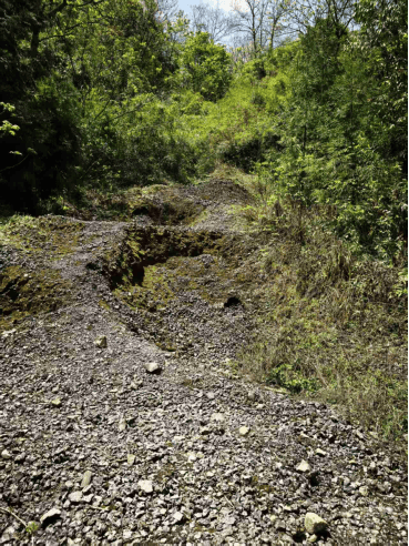 从水电站左边的水渠盖形成的平坦小路走10分钟,再往上爬林中小路5分钟,就进入带石塆超级巨大堆渣场中的4号考察点。