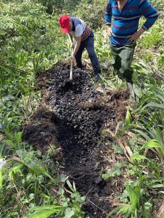 在4号点一块草坪上,长满扁竹叶草,草坪一揭开,下面都是铜硝子。为了取断面平均样,队员和向导轮流上场开挖。掘了一个一米深的探槽,成都理工大学队员按断面取了两袋综合样,回去做铜,二氧化硅等含量和锶的微含量。这个点的考察约两小时(含步行路程)。此次考察,证实了1987年洪雅县文管所的考察所言不虚。带石塆的铜冶渣所含的铜金属量,有可能超过一座大中型铜矿。