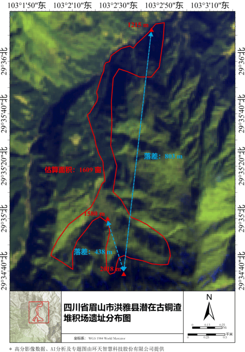 眉山环天智慧公司利用光谱分析,依据峨边五渡古铜渣堆积场分析经验作出的复兴村毛沟古铜渣堆积场遗址分布图。